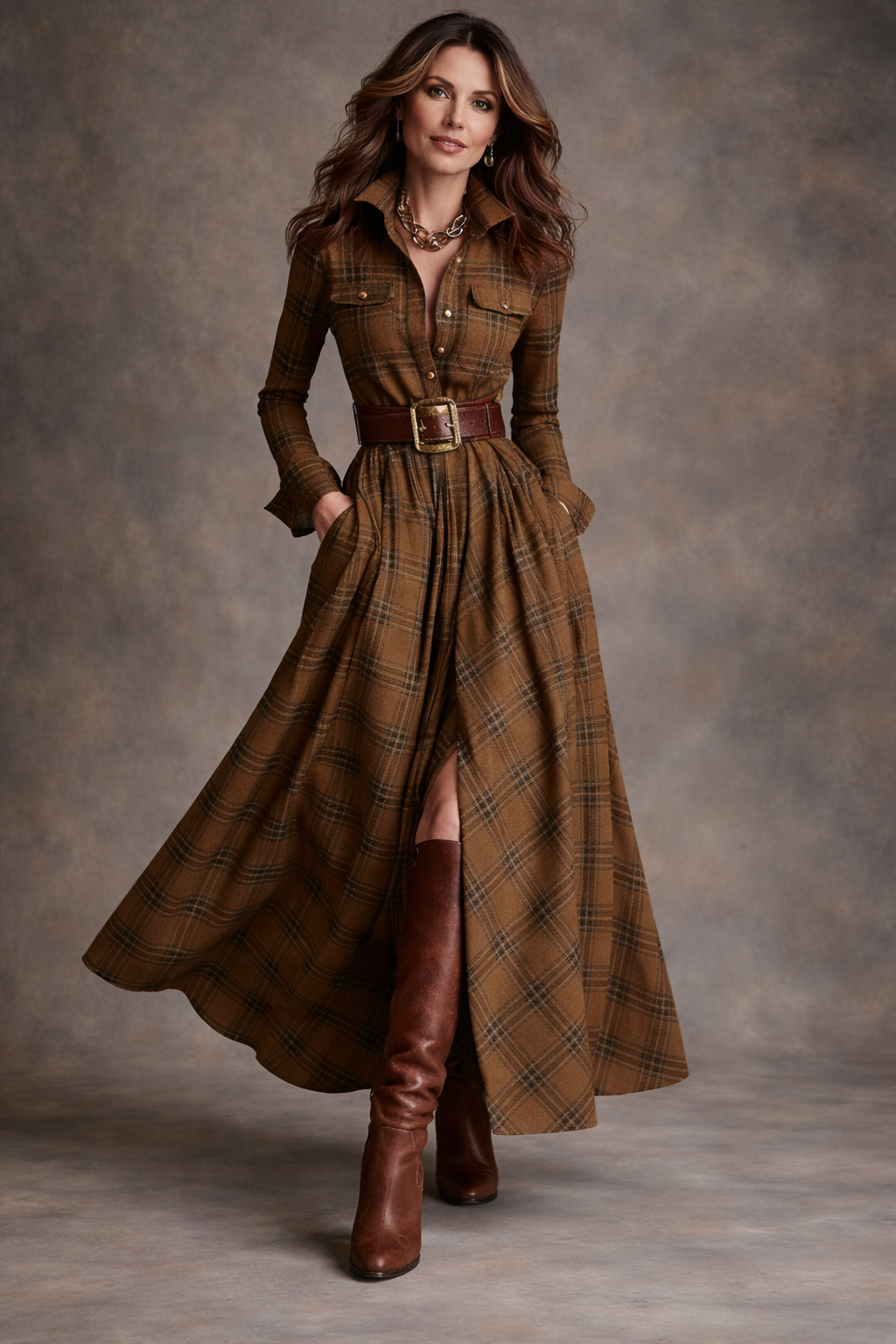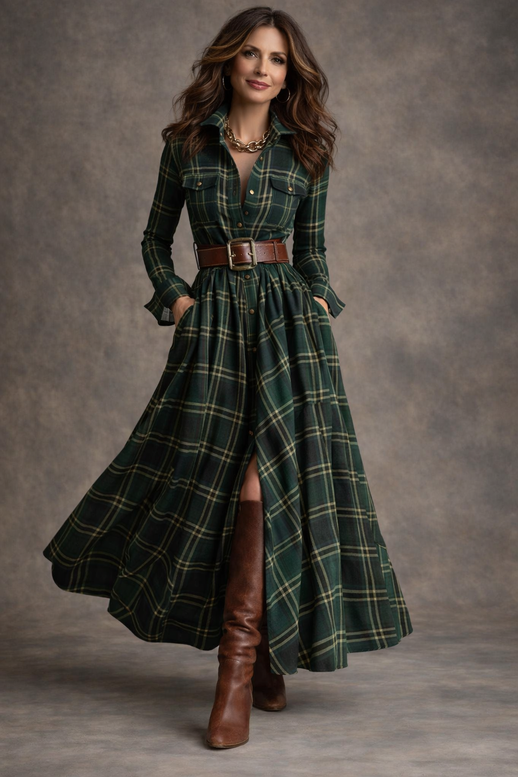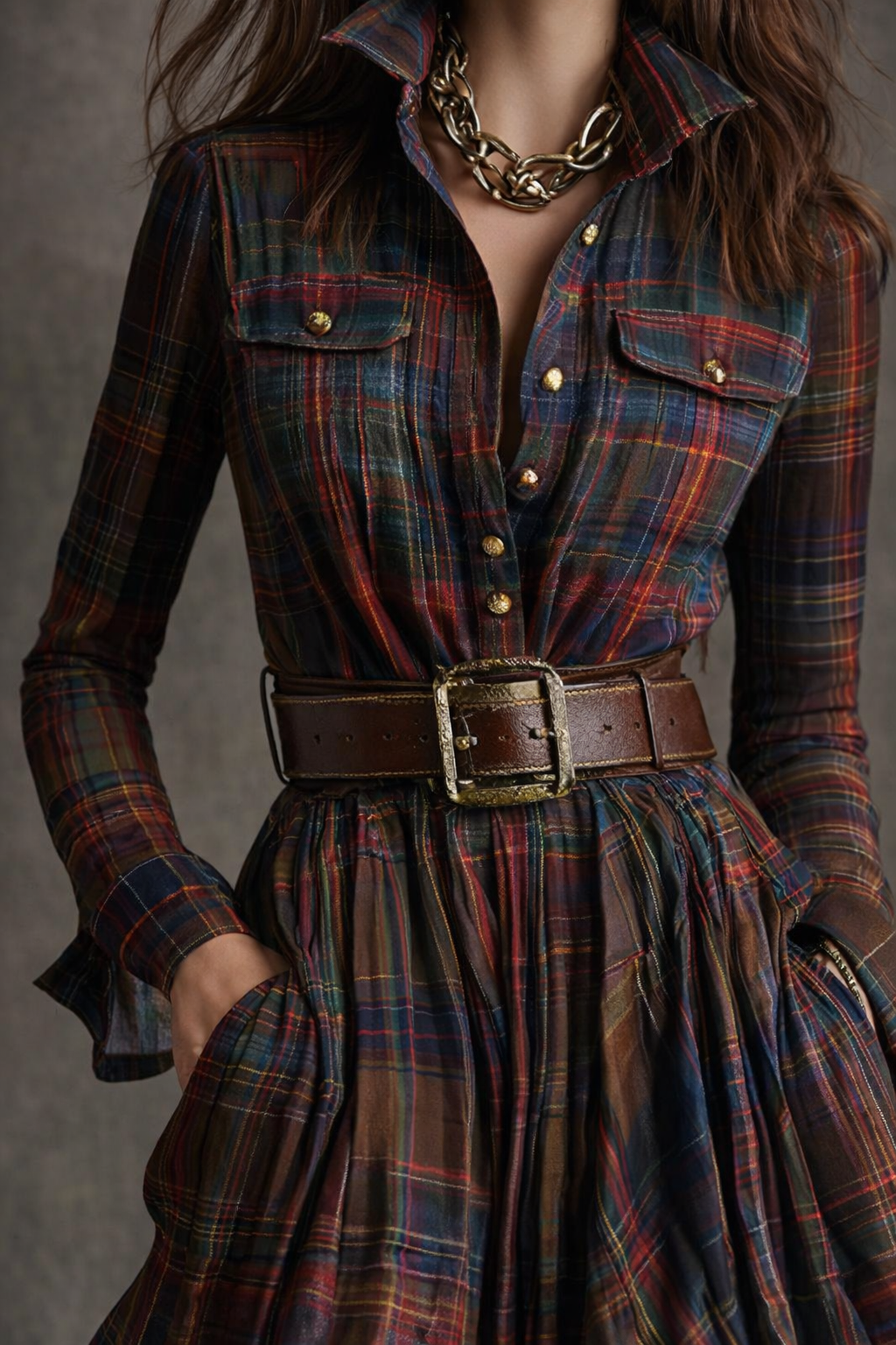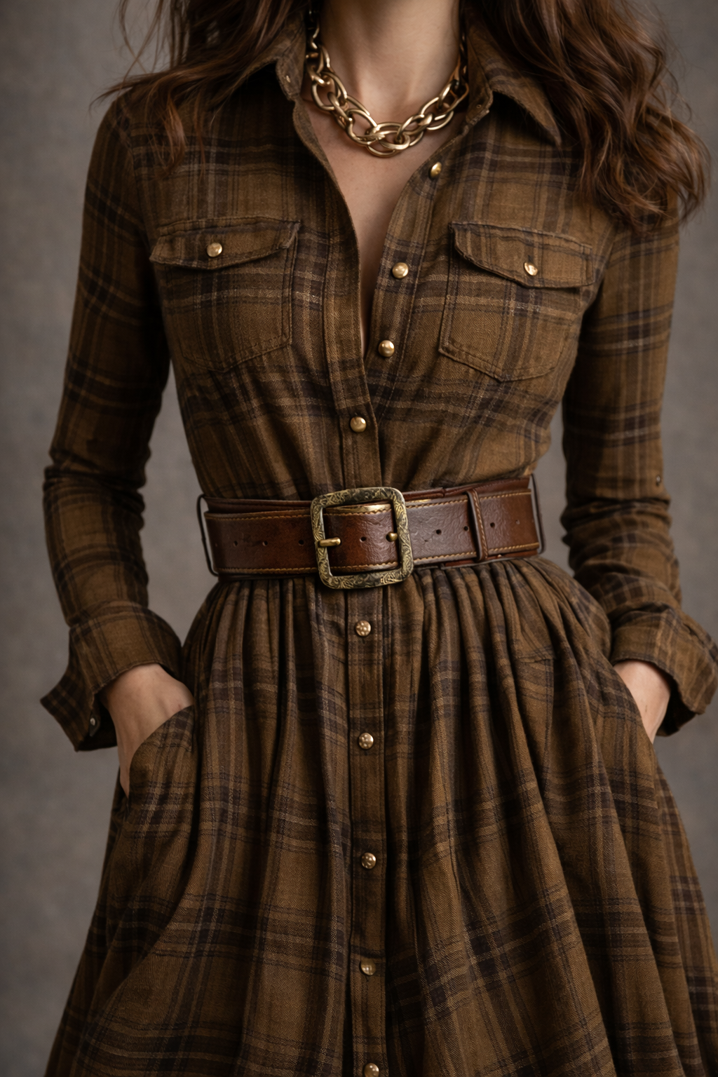 Su diseño de cuello camisero estructurado, mangas largas y cintura ceñida con cinturón crea una silueta equilibrada y femenina, perfecta para la temporada de otoño e invierno.